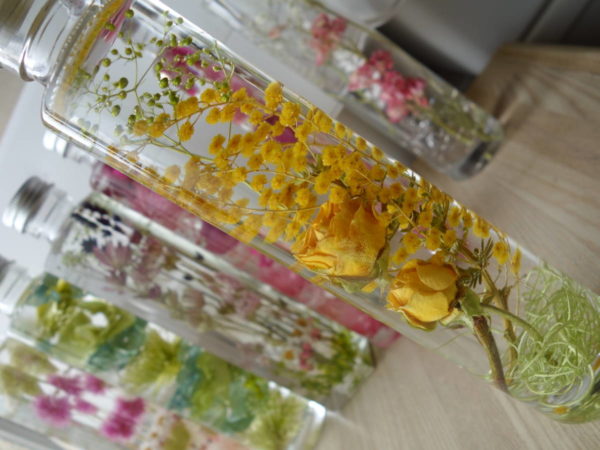 З допомогою гліцерину ви можете створити унікальний дизайнерський об’єкт. Помістіть 1 квітка або невелику композицію в красиву банку і залийте гліцерином. Ємність щільно закрийте і прикрасьте по своєму смаку.