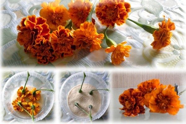 Подібний метод підходить для засушування квітів з великими бутонами. В якості десиканта ви можете вибрати будь-який матеріал, добре поглинає вологу. Підійде силікагель, наповнювач для котячого туалету або бура з борошном (у пропорціях 1:6).