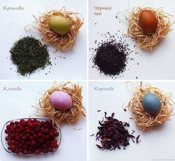 Для процедури відмінно підійде зелений чай каркаде або мате. З їх допомогою можна створити різні відтінки шкаралупи, наприклад, зелений чай додасть яйцям зелено-жовтий відтінок, мате – фісташковий, каркаде — від ніжно-бузкового до сіро-блакитного і навіть стійкого синього. Для фарбування попередньо заваріть міцний чай, а потім опустіть в заварку відварені яйця. Чим довше час впливу барвника – тим більш насиченим буде їх колір.
