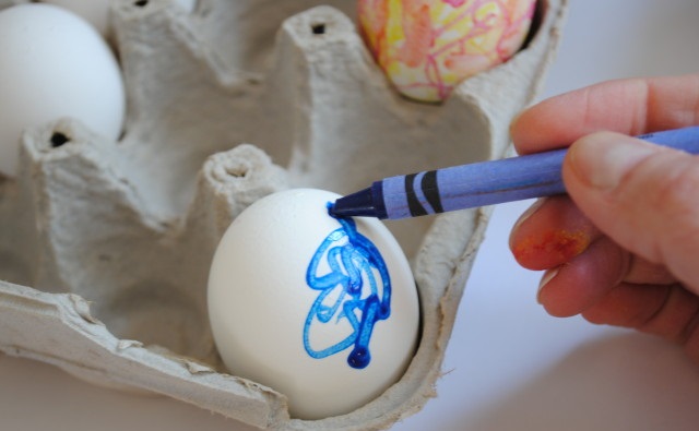 За допомогою воскового олівця фарбувати яйця можна разом з дітьми, при цьому можна проявити фантазію і намалювати на шкаралупі оригінальні розпливчасті візерунки. Зверніть увагу, що в методі використовуються гарячі яйця, тому потрібно діяти дуже обережно, особливо якщо в процесі бере участь дитина.