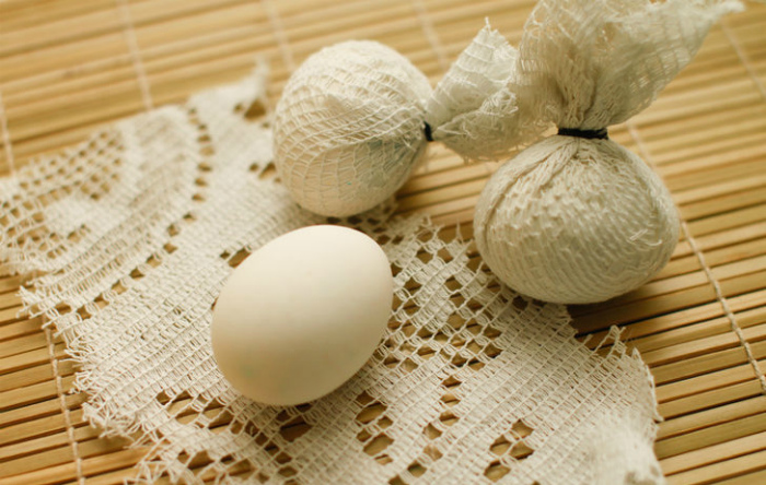 Для процедури можна застосовувати будь-які різнокольорові непотрібні клаптики. Оберніть сире яйце тканиною і помістіть в каструлю для варива, додавши у воду трохи оцту. Варити яйця в подібному вигляді потрібно довше звичайного.