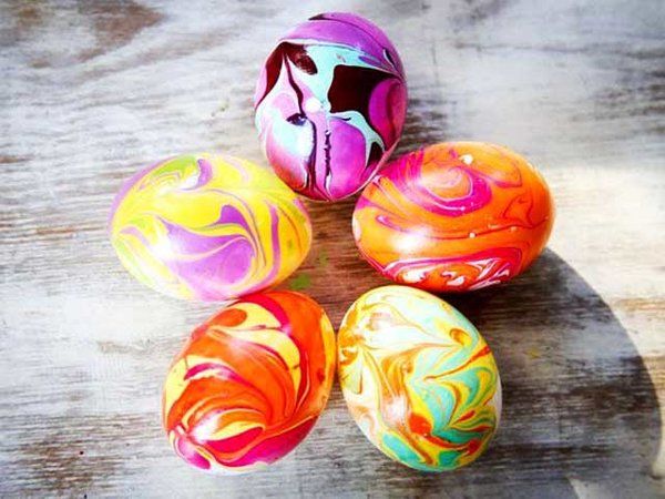 Оригінальний різнокольоровий візерунок на шкаралупі можна створити за допомогою звичайних лаків для нігтів. Налийте по парі крапель декількох відтінків лаків у ємність з водою і опустіть туди попередньо відварені яйця. Під час процедури використовуйте гумові рукавички. Детальна інструкція.