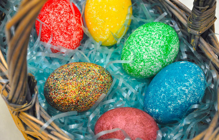 Для створення блискучих гламурних великодніх яєць можна прикрасити шкаралупу блискітками. На вже відварені яйця нанесіть трохи клею або білка. Щедро посипте поверхню блискітками і ще раз покрийте клеєм.