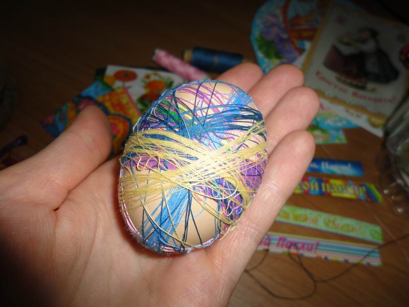 Процес фарбування нитками дуже схожий на процедуру фарбування тканиною. Для подібних цілей підійдуть нитки муліне різних відтінків. Ви можете сплутати нитки між собою для абстрактного візерунка або обернути шкаралупу рівними лініями для створення прямих різнокольорових смуг.