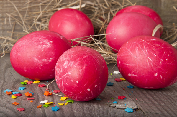 Шкаралупа, пофарбована в буряках, може бути від ніжно-рожевого до бордових відтінків. Приготуйте потрібну кількість сирої буряків і залийте гарячою водою. Дайте розчину настоятися і помістіть в ємність вже зварені яйця. Почекайте необхідний час. Для більш стійкого кольору додайте в склад трохи оцту.