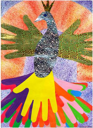 6. Оченята малюємо і приклеюємо до казкової пташці. Хвостик і крильця можна зробити в ладошковой техніці.