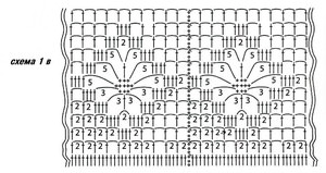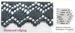 Спочатку зробіть ряд виворітними петлями. Якщо ви почали в’язання з нижньої кайми, то набраний ряд буде першим. У другому ряду по виворітній стороні провязывается нова послідовність петельок: кромочная, лицьова, п’ять особових петельок, після кожної з них слід три накиду. Повторюйте раппорт до закінчення ряду. Потім зробіть одну лицьову петлю і іншу кромочную.
