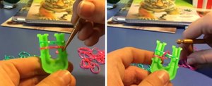 - Плетіння. Кожну нижню гумку перекидаємо над відповідним зубцем поверх верхнього гумки. Формуємо наступний ряд з трьох гумок з використанням принципу закріплення формування другого ряду, тобто закріплюємо кінці кожної гумки на другому і третьому зубці, четвертому і п’ятому, шостому і сьомому зубці. Повторюємо послідовність плетіння до отримання бажаної довжини браслета.