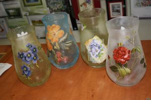 Цікавий ефект при декупажі скляних виробів дає штучне старіння поверхні і імітація потрісканої фарби.