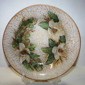 У підсумку отримуємо красиво прикрашену тарілку, якою можна спокійно користуватися, так як малюнок і лак знаходяться на зворотній стороні.