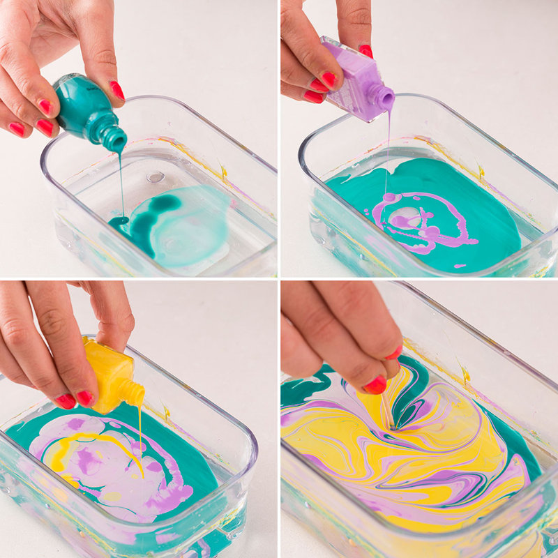 - Капніть з кожного бутылька по 2-3 краплі лаку на поверхню води.