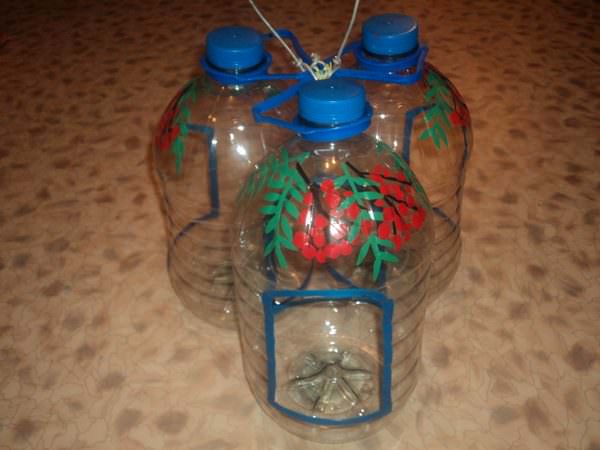 Щоб зробити таку годівницю, знадобиться відразу кілька пляшок різного обсягу. Та й процес її виготовлення не так вже простий. Але в результаті виходить дійсно красива, незвичайна конструкція, здатна стати головною прикрасою будь-якої дачної ділянки.