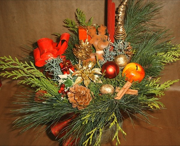 Новорічну ікебану неможливо уявити без такого елемента, як ялинкові гілки. Тут можна обійтися без штучних деталей. Зроблена з природних елементів новорічна ікебана буде не тільки красиво виглядати, але ще й пахнути.