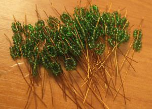 Для створення тичинок потрібно набрати сімнадцять світлих зелених бісеринок, а також три жовтих і сформувати петлю. Так, формується віяло з тичинок для квітки.