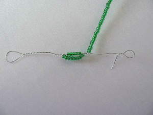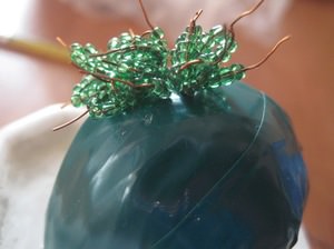 Дев’ять бісеринок блакитного кольору і дві темного нанизуємо на дріт. До останньої бісеринці кріпиться ще дріт з 13 світло-блакитних і 3 темних горошин бісеру. Бісер обов’язково повинен якомога щільніше прилягати до першого ряду.