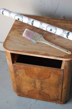 - Після цього меблі потрібно покрити товстим шаром клею ПВХ. Також потрібно просочити тканину або шпалери цим же клеєм. Дати всьому трохи просохнути.