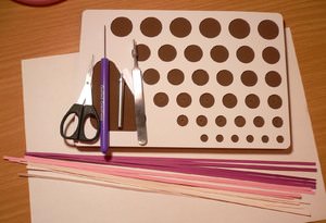 - Другий крок. Створені смужки накручуємо на інструмент для закручування папери. Вийдуть дуже міцні кружечки, з них треба створювати певним чином елементи і трошки розпускати натяг спіралі. Щоб було простіше розпустити до необхідних розмірів накручені паперові деталі, беріть лінійку з шаблонами фігурок: вкладемо в потрібні по діаметру шаблони гуртків три види: маленький, більше, більше.