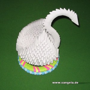 Потім 39 блакитних і 78 зелених, для шиї і кінців крилець – 36 блакитних і 19 фіолетових. А якщо ви захочете зробити білосніжного лебедя з паперу або серветок, схема включає 458 елементів і дзьоб яскравого кольору.