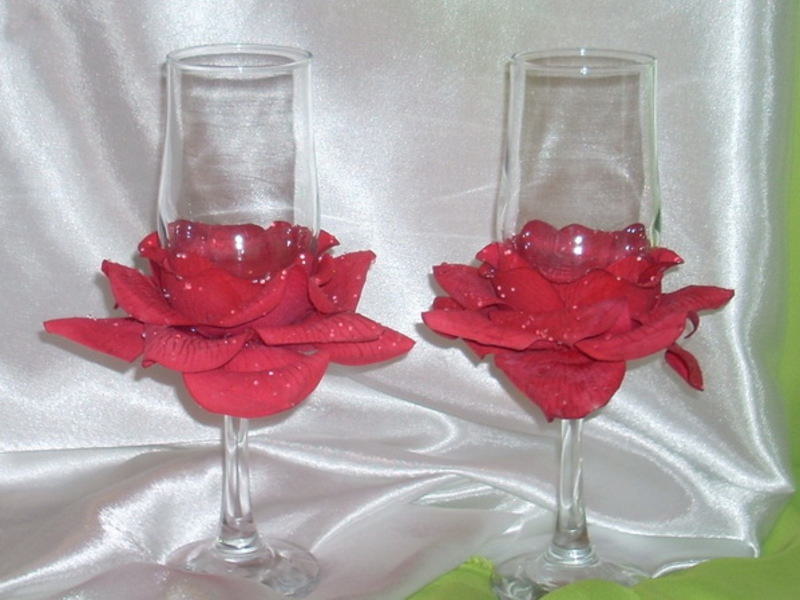 Для весільної розпису фужерів люди з творчою фантазією використовують ідеї будь-яких рослинних і тваринних зображень. Розпис по склу доповнюється іншими декоративними елементами.