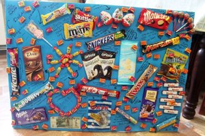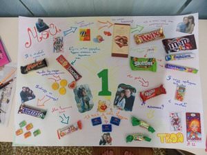 Різні солодощі: шоколадні батончики, цукерки, драже, мармелад, соки. Бажано віддавати перевагу солодощам, на яких є великі написи.- Ватман. В якості альтернативи можна склеїти скотчем папір формату А4.