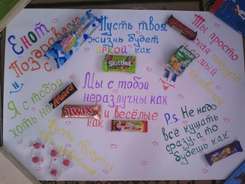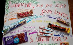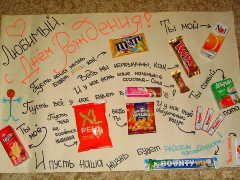 Хоч деякі і кажуть, що чоловікові або своєму хлопцеві на др не варто дарувати солодкий прикольний колаж з шоколадок, прикрашений смішними фотками і повний привітань… Взагалі, зараз модно стало міркувати на тему – що ж категорично не можна дарувати тоді-то і того-то. Подивишся так послухаєш таких «експертів» і розумієш – взагалі нічого нікому дарувати не можна. Однак, попрацювати перед днем народження і зробити своїми руками такий колаж, а потім подарувати його, все-таки варто. Хто вважає інакше — нехай придумає щось краще, цікавіше і цікавіше. А ми спробуємо зробити цей ексклюзив для коханої людини.