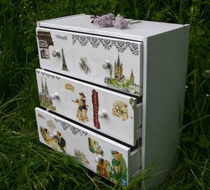 Таким чином декорується вся поверхня комода, відповідно до задуманого декору. І ось, вся поверхня готова, декупаж міні комода практично завершено. Тепер необхідно залишити річ на добу для повного висихання клею. Через покладений час можна приступати до покриття вироби лаком. Його можна наносити, як і фарбу, пензлем або губкою. Після нанесення кожного шару треба дати висохнути, все ж можна наносити до трьох шарів. Після повної просушки останнього шару, що робота закінчена, декор комода виконаний. Тепер квартиру умільця прикрашає неординарна і модна річ.