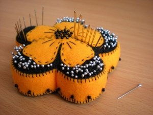 Ще прекрасно виглядатиме игольниц з фетру у вигляді пелюстки. Вирізаємо з фетру дві пелюстки, заповнюємо основою і зшиваємо. Краще зробити маленький гачечок, щоб можна було підвішувати вашу ігольніцю.