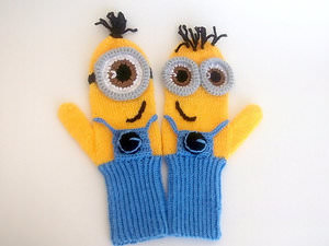 Дуже часто міньйони з мультика зустрічаються на дитячому одязі. Таких персонажів можна зустріти не тільки на кофточках і футболках, але і на в’язаних виробах. Таких міньйонів можна зв’язати не тільки рукавиці і рукавички, а також і шкарпетки і оригінальні пінетки і іграшку — міньйон. Схема малюнка дуже проста, і з нею впорається навіть починаючий майстер з в’язання, придасться вона і для в’язання для хлопчика і для дівчинки, навіть якщо маляті ще рік, і він ще не дивиться мультфільми.