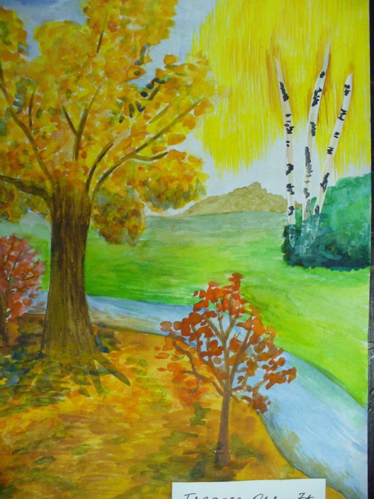Щоб красиво передати осінній пейзаж, рисунок спочатку проводимо олівцем. Обкреслюємо лініями небо і землю – верхня і нижня смуга, можна намалювати гору. Потім поетапно малюємо дерева: стовбур, гілки, листя. В осінній пейзаж можна включити річку і ще не сховалися рибок.