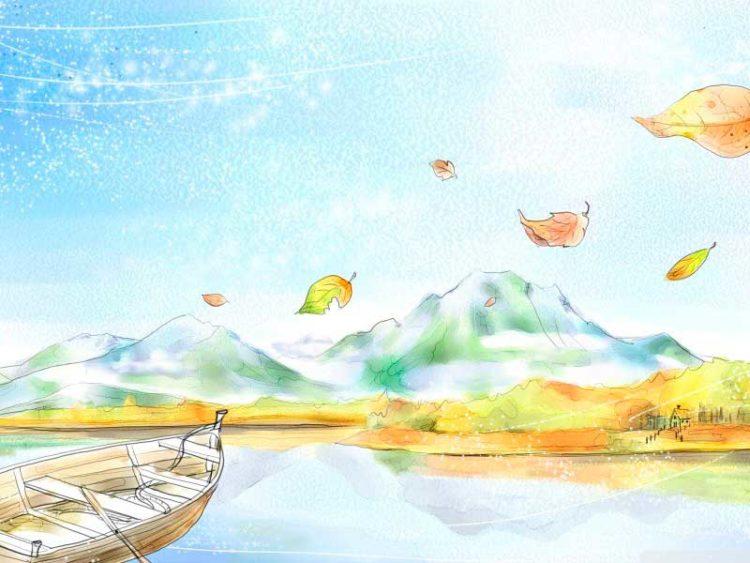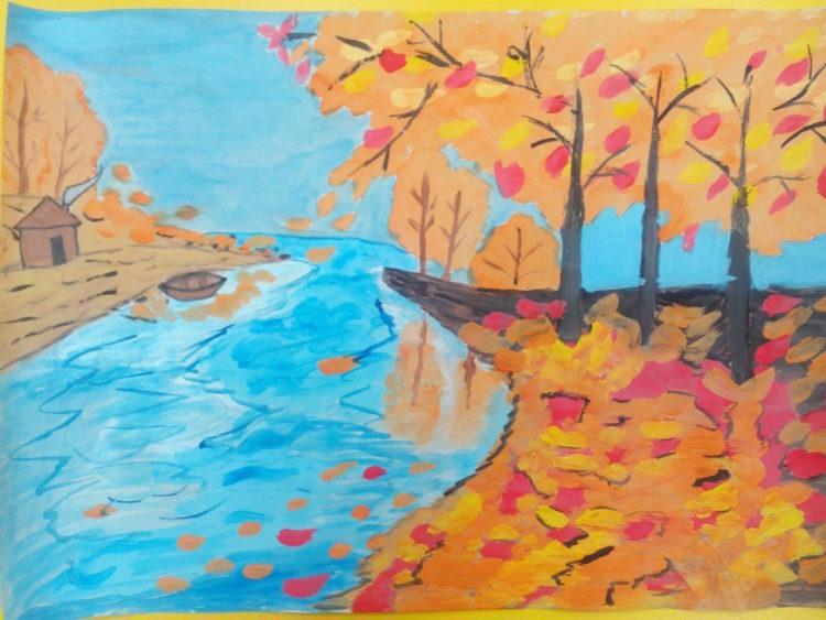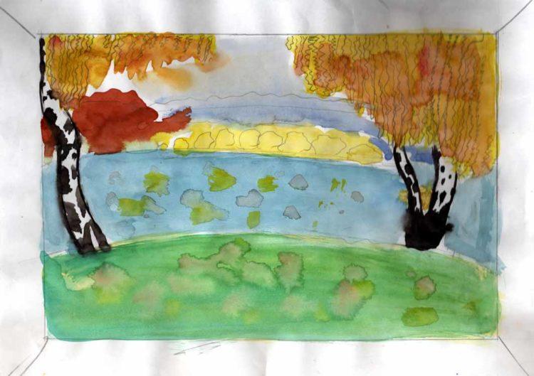 Щоб красиво передати осінній пейзаж, рисунок спочатку проводимо олівцем. Обкреслюємо лініями небо і землю – верхня і нижня смуга, можна намалювати гору. Потім поетапно малюємо дерева: стовбур, гілки, листя. В осінній пейзаж можна включити річку і ще не сховалися рибок.
