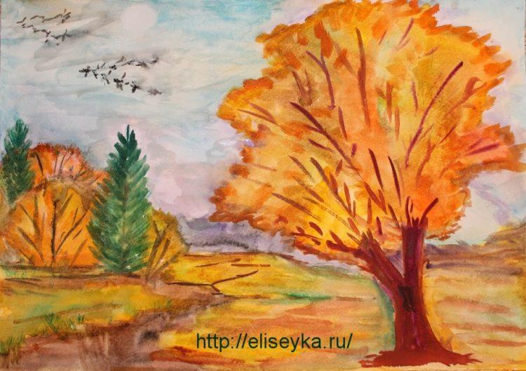 Малюнки на тему осінь малювати легко. Для початку на аркуші паперу потрібно намітити розташування об’єктів: де буде стояти дерево з листками або без, зелена сосна, де буде рости трава, які хмаринки на небі, особливо, якщо це пізня осінь. Легко можна намалювати малюнки про осінь, де є поле, а в небі темні крапочки відлітаючих журавлів.