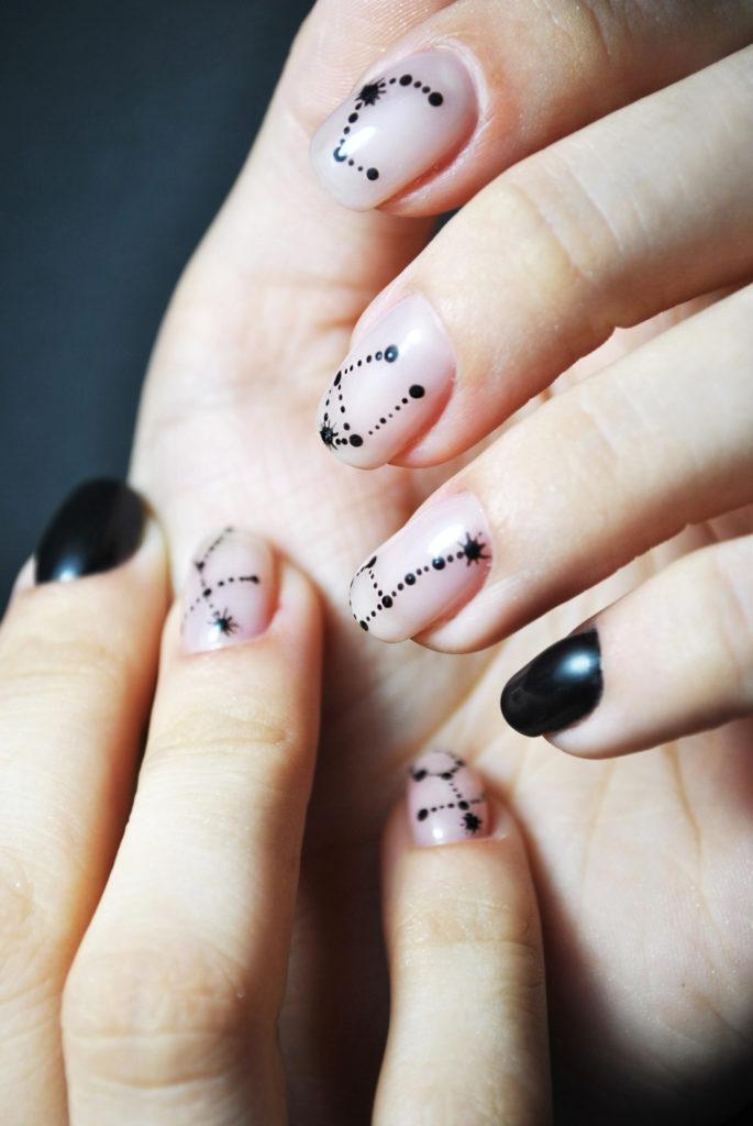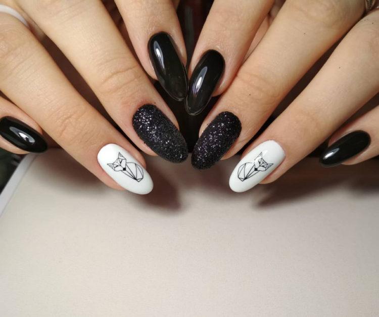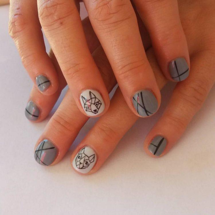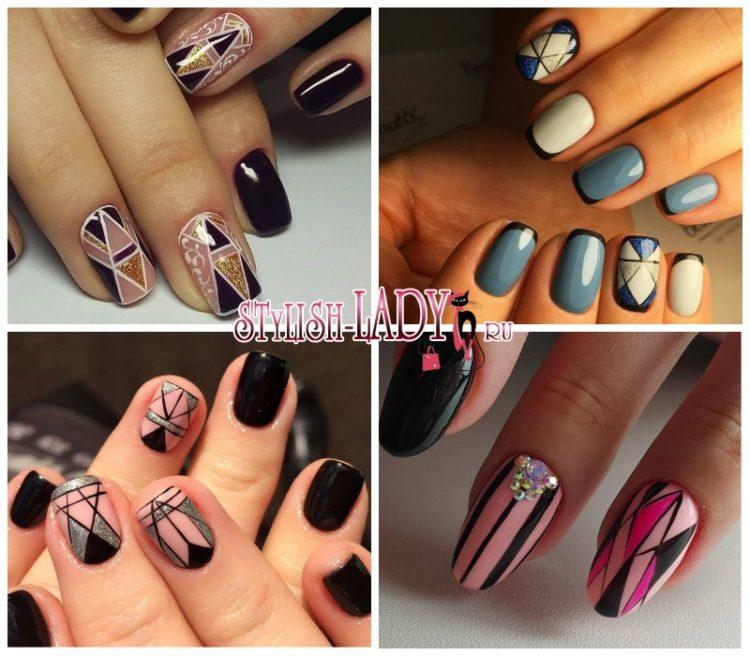 Геометрія – манікюр, який може виглядати вельми незвично. Красива графічна лінія може бути доповнена візерунком або точками. Всіма улюблений френч у стилі геометрії буде виглядати також цікаво. Чорний колір дуже незвично підкреслять білі прозорі смужки, а геометрична кішка на нігтях додасть образу цікаву родзинку.