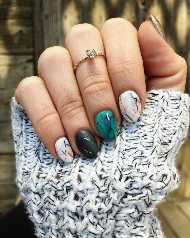 Дизайн мармур на нігтях завжди виглядає шикарно у певних кольорах: чорному, білому, бежевому. Вигідно виглядає в кавовому, рожевому, блакитному, бірюзовому, зеленому кольорах. Мармуровий дизайн нігтів завжди доречний та актуальний, особливо якщо нігті короткі.