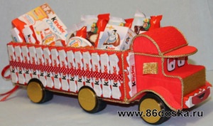 Робимо колеса, їх у вантажівки 6. Вирізаємо кружечки з картону і склеюємо між собою 3-4 кола, залежно від товщини картону, приклеюємо до машини. Робимо поріжок біля дверцята в кабіні. Вирізаємо крила з картону, обклеюємо папером, вигинаємо і приєднуємо над колесами кабіни. Над крилами до кабіні приклеюємо цукерки фари. Всю машину акуратно обклеюємо шоколадками, на кожну зверху і знизу капаємо по крапельці клею.