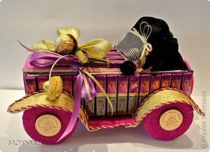 Простіше зробити основу з пінопласту. Акуратно вирізаємо з цільного шматка фігуру, схожу на джип. Гофрованої папером обраного вами кольору обклеюємо основу. Папір намазуємо клеєм по всій площі і добре притискаємо до пінопласту. Особливо ретельно заклеюємо кути.Далі вигляд автомобіля залежить від творчості самого майстра. Приклеюємо сріблясту або золотисту папір для вікон. Можна приклеїти на лобовому склі очі і посмішку. Оформити капот і бампер,приклеїти круглі цукерки замість фар.