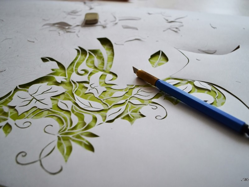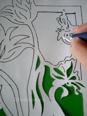 Найскладніше вирізати закруглені лінії, тому новачкам краще вибирати шаблони без вигинів. Для вирізання хвилястих ліній рекомендується використовувати ножиці із закругленими кінцями.- Найдрібніші деталі найкраще вирізати ножем або лезом, поклавши аркуш на стіл. Під шаблон обов’язково треба підкласти шматок картону, щоб не порізати стіл під час роботи ножем.