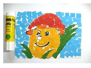 Найлегший спосіб для того щоб створити з дитиною аплікацію-мозаїку з паперу, це застосувати техніку «рваною» мозаїки. Що для цього нам знадобиться? Візьміть будь-яку кольоровий папір і порвіть її на шматочки. Далі, разом з малюком наклейте їх на звичайний трафарет у відповідності з певними квітами. За допомогою фломастера намалюйте відсутні деталі. От і все! Рвана мозаїка готова!