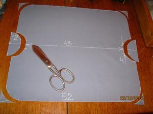 Перед розкриємо тканина складаємо навпіл, накладаємо викрійку так, щоб нижня її частина з вирізаними напівкруглими кутами лежала впритул до місця згину. В принципі, при даних розмірах припуски на шви вже входять в викрійку і робити їх необов’язково. Вони складають приблизно від 0,5 до 2 см, в залежності від тканини.