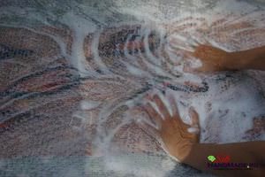- Поверх валяного шарфика покладемо марлю і нанесемо суміш на всю поверхню узорчика. Постараємося не соватися, щоб узорчік не порушився. Повільно разгладим шарф, трошки натискаючи. Коли шерсть візьметься, почнемо розгладжувати все активніше, з усією силою.