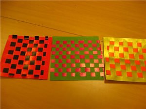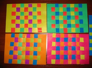 - Продовжувати збірку килимка, просовуючи смужки паперу одну за одною, дотримуючись шаховий малюнок.