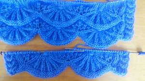 Ширину узорчика можна міняти і самому вибирати в залежності від розмірів речі. Таким чином, наприклад, для прикраси кромки подолу можна брати досить дрібні волани. Якщо ж ви хочете покрити цим візерунком майже всю річ, то алсацийские гребінці варто створювати великими.- Проте не потрібно думати, що застосування візерунка алсацийские гребінці обмежується тільки прикрасою поділів. Ці мереживні півкола повністю універсальні, тому вони можуть з легкістю прикрасити будь-в’язане виріб. Наприклад, можна виконати з їх допомогою неповторний зимовий комплект.