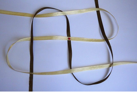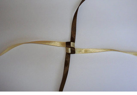 - Стрічки розкладаємо хрест-навхрест, темна внизу. У центрі фіксуємо шпилькою або голкою.