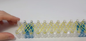 - Далі, выплетаются стінки. Зліва направо накидаємо гумки з першого стовпчика близького ряду на другий. Потім з другого стовпчика на третій, і так далі. Коли залишається останній стовпчик, потрібно з’єднати його з першим стовпчиком верхнього ряду, після чого продовжити накидати гумки зліва направо, але вже згори. Коли ряд закінчився, потрібно з’єднати крайні штирі.