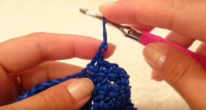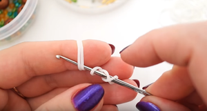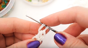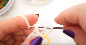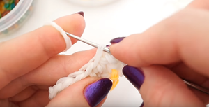 Дві ланки, якими ми закінчили, потрібно позначити будь-яким способом — нав’язати нитку або резиночку. Потім, щоб піднятися вище, через них пропускаємо ще дві гумки.- Наступний ряд починаємо з того, що вплітаємо дві гумки в саму першу потрійну петлю, витягуємо її і знову отримуємо 4 на гачку. З’єднуємо, як зазвичай.