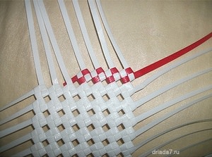 Залишилося попрацювати з смужками, які будуть заплітатися всередину виробу. Правда, робити це дуже незручно. Полегшити собі завдання можна, продевая кожну стрічку назовні. Їх необхідно також проплести до самого кінця. Описаним способом робота ведеться і з другою стороною.