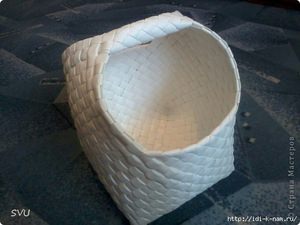 Тепер можна переходити до боках і краях виробу. Майстру потрібно проплести боку майбутньої кошики, поки позначки не перетнуться і знову закріпити результат за допомогою степлера. Визначившись з розташуванням краю, можна починати одну за одною забирати стрічки до тих пір, поки не попадеться смужка з позначками. Друга сторона краю проплетается на аналогічній висоті. Залишилося протягнути краю і проплести стрічки до кінця через весь виріб.