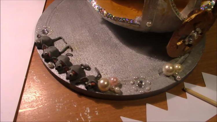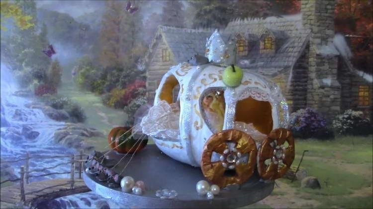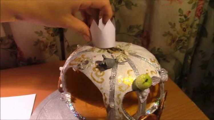 - Декоруємо гарбуз наклейками, намистинками, розмальовуємо красиво фарбою. Нижче на відео ви зможете бачити різні ідеї декорування такої карети. Головне, щоб все було на тему казки «Попелюшка», і до цього також можна додати тему «Осінь».