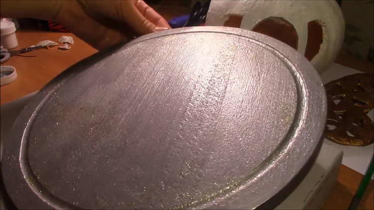 - Можна гарбуз встановити на картонну кришку від коробки з-під взуття. На ній будуть розташовані коні-миші та інший декор. Але краще всього взяти круглу обробну дошку. Її також можна прикрасити. Але для початку покриваємо її сріблястою акриловою фарбою.