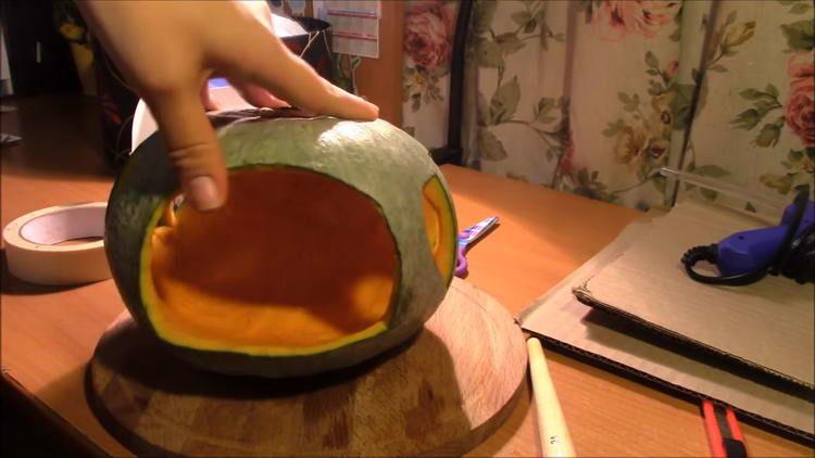 - За допомогою ножа та ложки вичищаємо всю м’якоть і насіння всередині гарбуза через отвори, майбутні двері і вікна. Ваша виріб карета з гарбуза може мати трохи інший дизайн вікон і дверей в залежності від вашої фантазії.