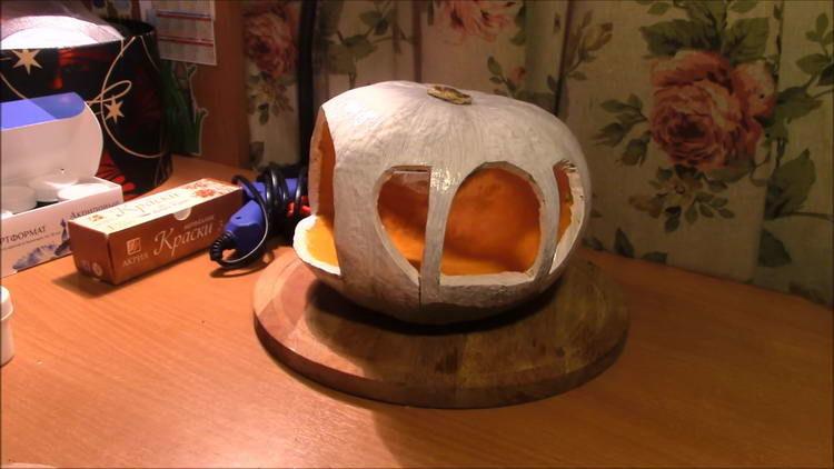 - Коли все всередині гарбуза вичищено, необхідно покрити білою акриловою фарбою майбутній транспорт для нашої Попелюшки. Ви можете подивитися картинки з книг та інтернету і вибрати відповідний колір майбутньої карети. Дітям дуже подобаються вироби з овочів, тому вони з радістю вам допоможуть вирізати, фарбувати або малювати, в залежності від віку дитини. Така карета з гарбуза – виріб в садок або школу розвиває фантазію й творчі навички у дітей.